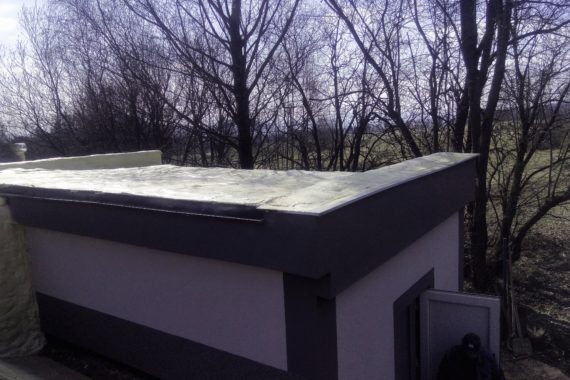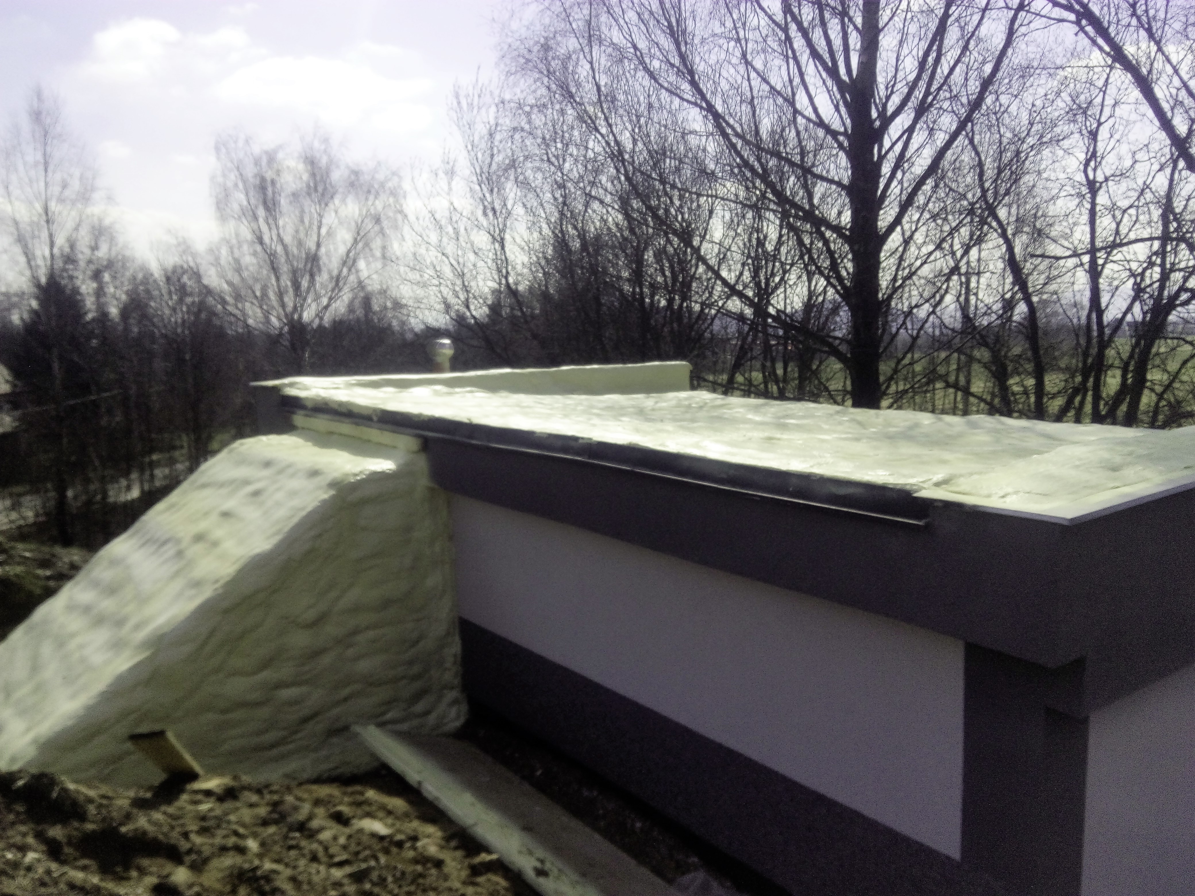 Tepelná izolace ploché střechy vodárny. Použita tvrdá PUR pěna PUREX NG-0440 s následným UV nátěrem proti poškození povětrnostními vlivy a slunečním zářením.