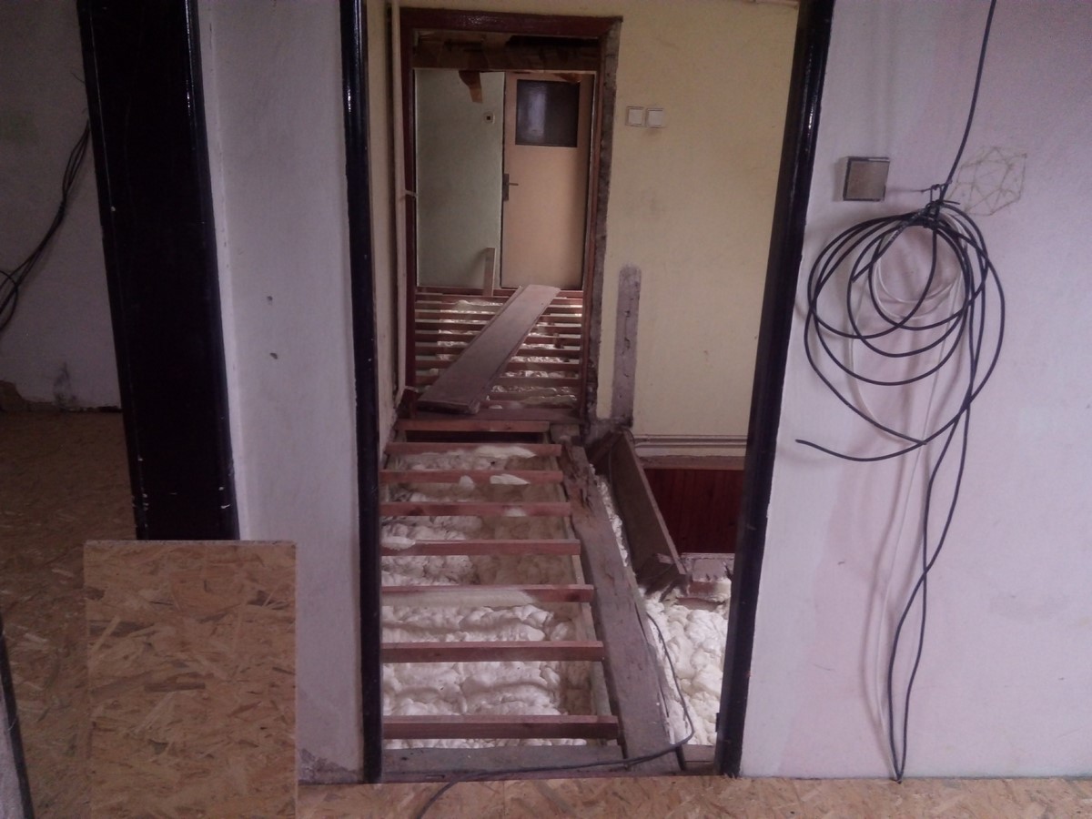 Tepelná izolace podlahy prvního patra v renovovaném rodinném domě do připravené laťové konstrukce. Následná příprava na podlahu. Izolace prováděna jako součást rekonstrukce na klíč. Použita PUR pěna PUREX NG-0808. Zateplení podkroví o ploše 185 m2 proběhlo během jednoho pracovního dne včetně úklidu. Orientační cena stříkané izolace 67 500 Kč.