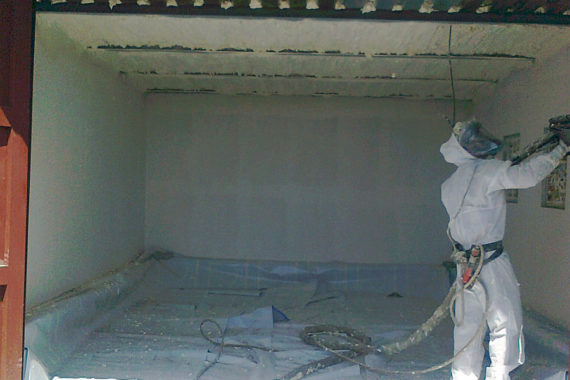Tepelná izolace garáže tvrdou PUR pěnou. Bez použití konstrukcí, zádržných a lepících systému, parozábran. Stříkaná izolace zajišťuje zároveň i hydroizolaci. Použita PUR pěna PUREX NG0430. Zateplení všech stran garáže o ploše 80m2 za jeden pracovní den, včetně úklidu. Orientační cena izolace pěnou 26 500 Kč.