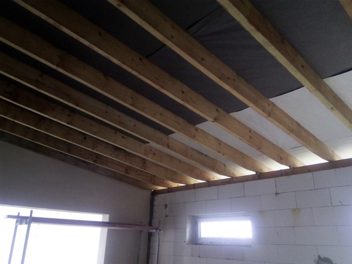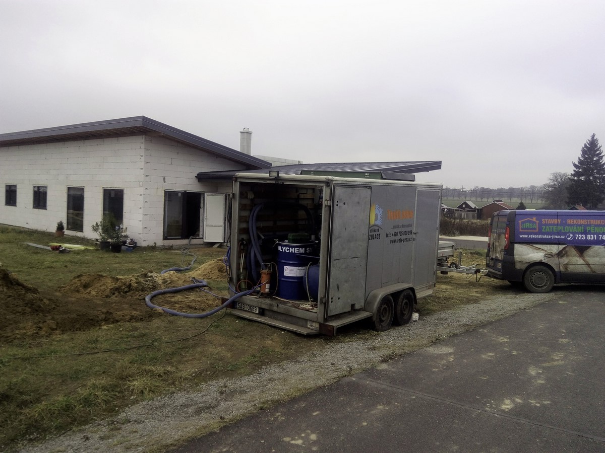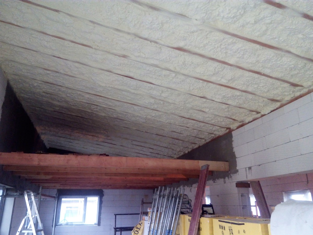 Tepelná izolace stropu bungalovu – jednopatrového rodinného domu – mezi trámy. Použita PUR pěna PUREX NG-0808 . Zateplení o ploše 155 m2 proběhlo během jednoho pracovního dne včetně úklidu. Orientační cena stříkané izolace 56 600 Kč.