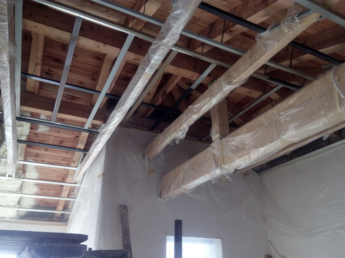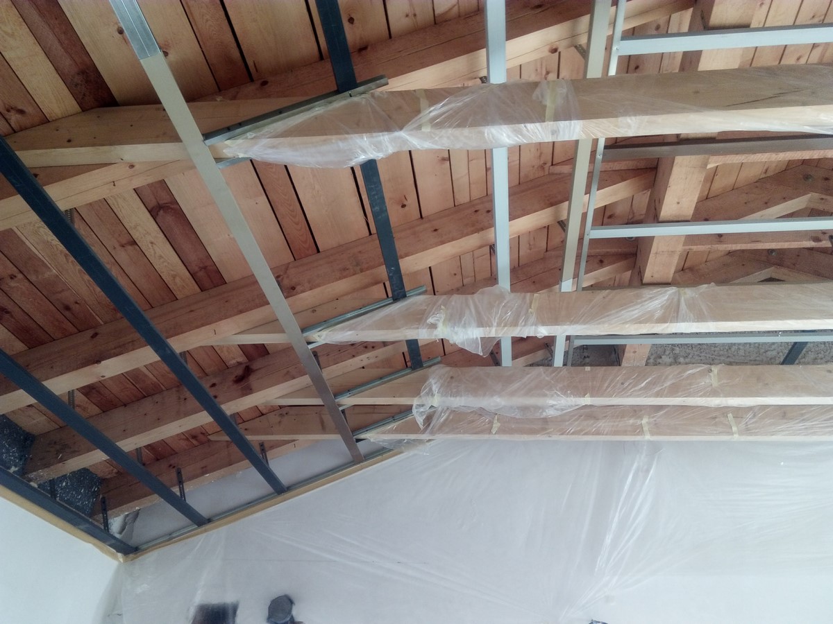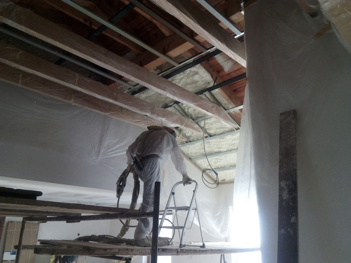 Tepelná izolace podkroví rodinného domu mezi trámy. Použita PUR pěna PUREX NG-0808. Zateplení podkroví o ploše 140 m2 proběhlo během jednoho pracovního dne včetně úklidu. Orientační cena stříkané izolace 51 100 Kč.