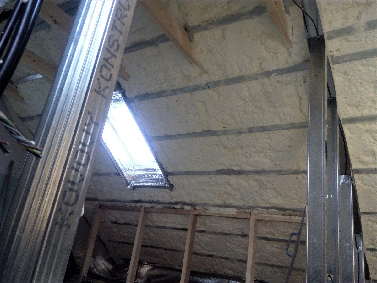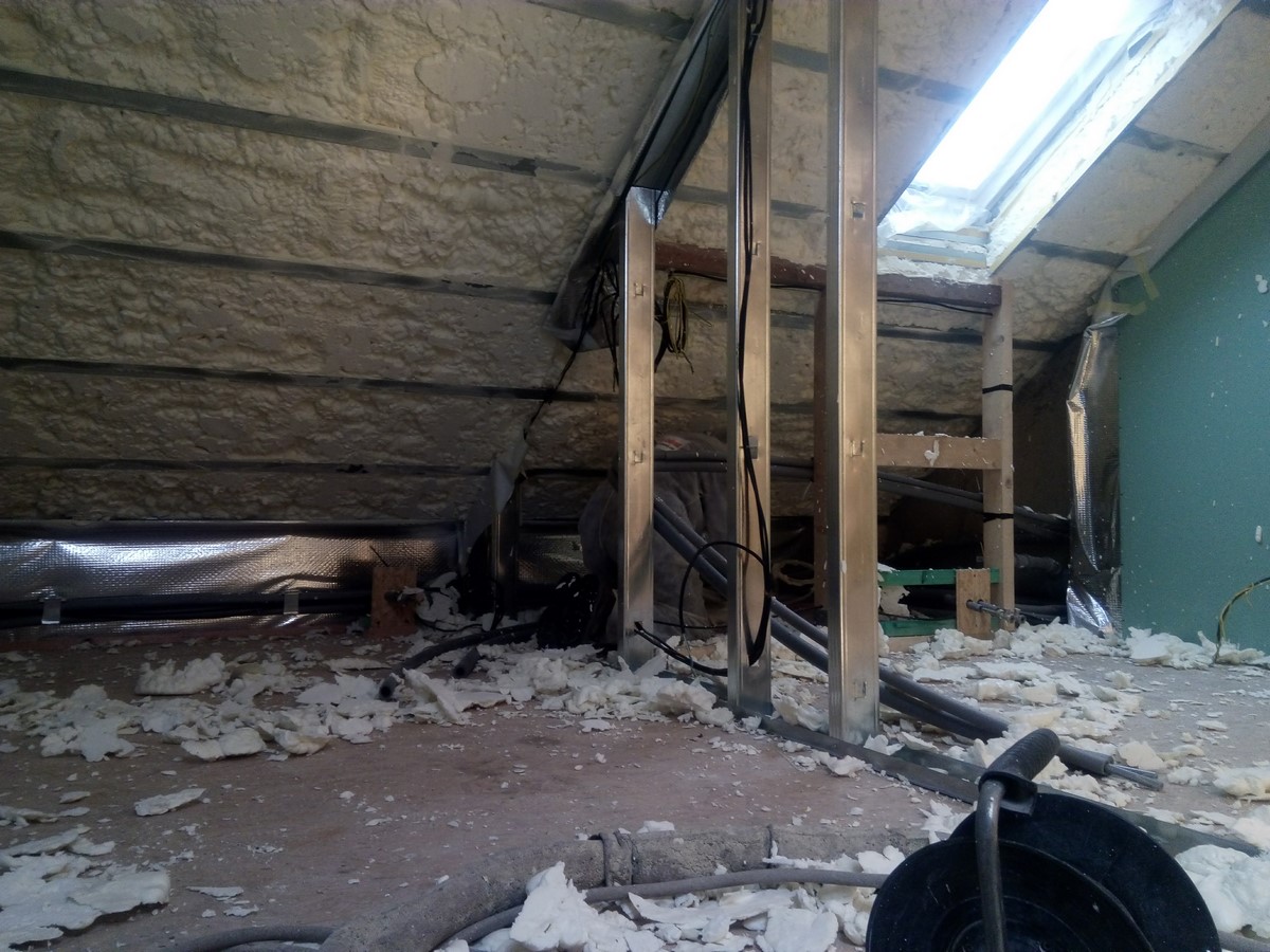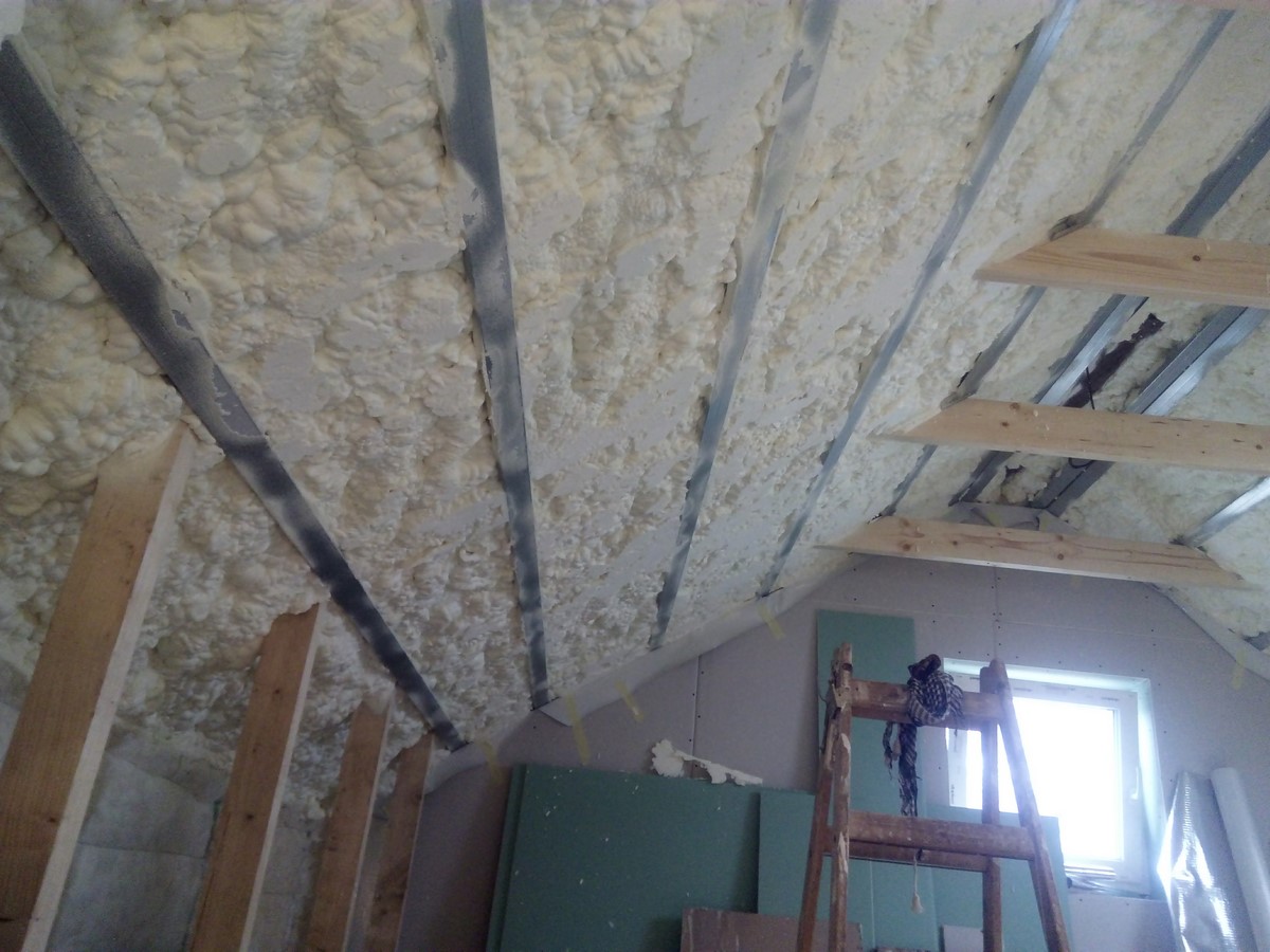 Tepelná izolace podkroví v rodinném domě do připravené sádrokartonové konstrukce s ořezem přesahujícího materiálu. Použita PUR pěna PUREX NG-0808. Zateplení podkroví o ploše 180 m2 proběhlo během jednoho pracovního dne včetně ořezu a následného úklidu. Orientační cena stříkané izolace 65 700 Kč.